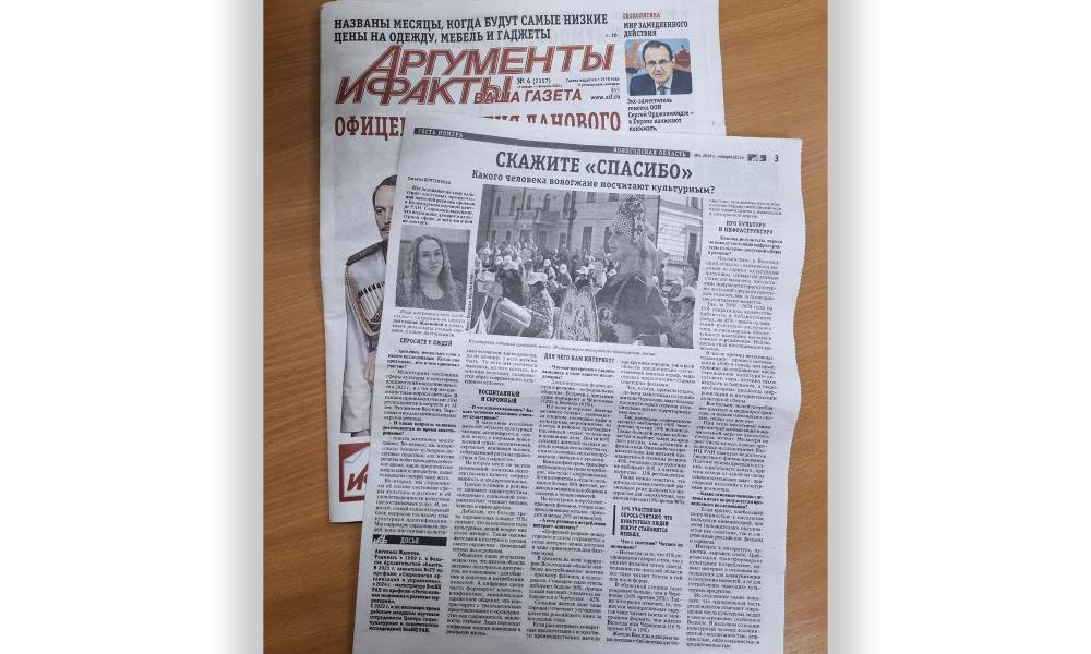 Издание «Аргументы и факты» (№4, 2026) опубликовало интервью исследователя ВолНЦ РАН «Скажите “спасибо”. Какого человека вологжане посчитают культурным?». Младший научный сотрудник Центра социокультурных и политических исследований Вологодского научного центра РАН Ангелина Эдуардовна Жданова рассказала о предпочтениях вологжан в культурной сфере, их удовлетворенности качеством предоставляемых услуг, характеристиках, присущих «культурному человеку».