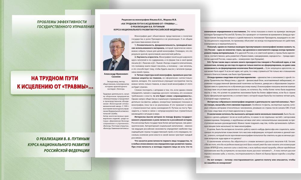 В декабре 2025 года вышла монография «На трудном пути к исцелению от «травмы»… о реализации В.В. Путиным курса национального развития Российской Федерации», подготовленная членом-корреспондентом РАН В.А. Ильиным в соавторстве с к.э.н. М.В. Моревым. В издании представлен авторский взгляд на события и процессы, которыми сопровождается курс национального развития, направленный на укрепление национального суверенитета, реализуемый Президентом РФ В.В. Путиным на протяжении последних 25 лет. Книга основана на результатах долгосрочного мониторинга эффективности государственного управления, который ведется Вологодским научным центром РАН с середины 1990-х гг. и включает в себя, в том числе, комплексный социологический мониторинг состояния общества: оценки населения относительно положения дел в стране, деятельности органов власти всех уровней публичной системы государственного управления, своего психологического состояния, восприятия динамики уровня и качества жизни и многие другие аспекты.