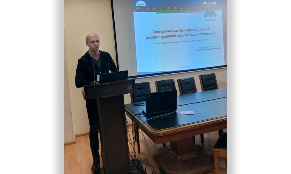 Ведущий научный сотрудник Центра социально-демографических исследований к.э.н. Андрей Васильевич Попов выступил в качестве сомодератора секции № 18 «Социальные проблемы труда в условиях новых вызовов», посвященной актуальным тенденциям и последствиям трансформации сферы труда, и представил доклад на тему «Поведенческие факторы и условия распространения прекаризации занятости». В ходе презентации были показаны изменения в занятости населения в разрезе субъектов РФ с разным уровнем дохода. Одним из заметных наблюдений стало нарастание занятости в неформальном секторе и платформенной работы, масштабы которых достигли своего максимума в самых бедных регионах (32 и 7% соответственно на 2023 г.). В докладе подчеркивалось, что размытие стандартной модели трудовых отношений относится к числу важнейших драйверов снижения устойчивости положения работников. При этом, помимо характеристик выбранного места работы (в т.ч. наличия профсоюза), весомая роль отводится стратегиям поведения на рынке труда. Так, индивидуальные решения, принимаемые людьми на разных этапах профессионального пути, повышают риски прекаризации занятости. Это могут быть траектории на работу не по специальности, раннюю занятость, использование неформальных каналов трудоустройства, частую смену места работы и т.д. Все это имеет особое значение на старте карьеры и не теряет своей актуальности со временем.